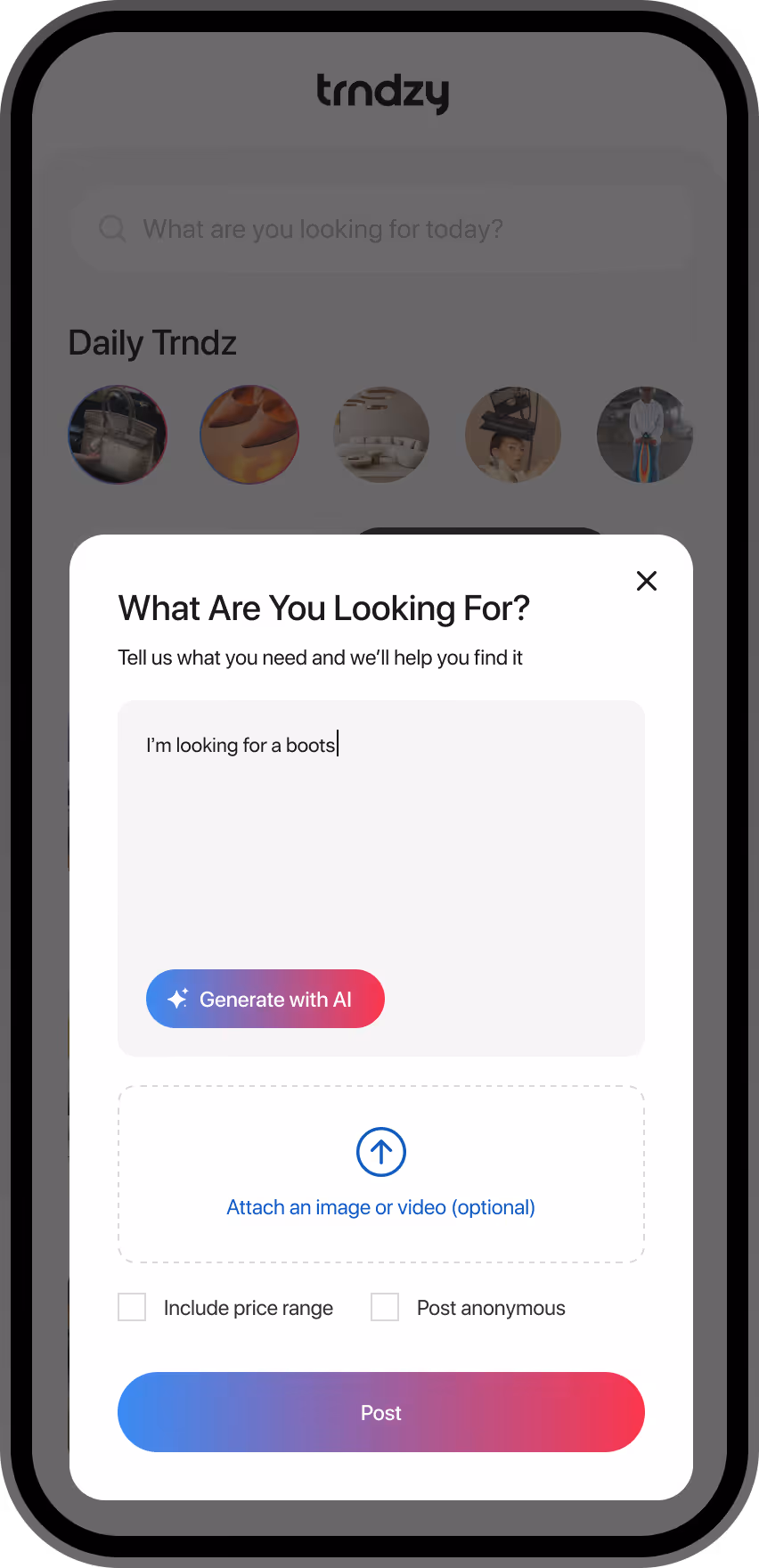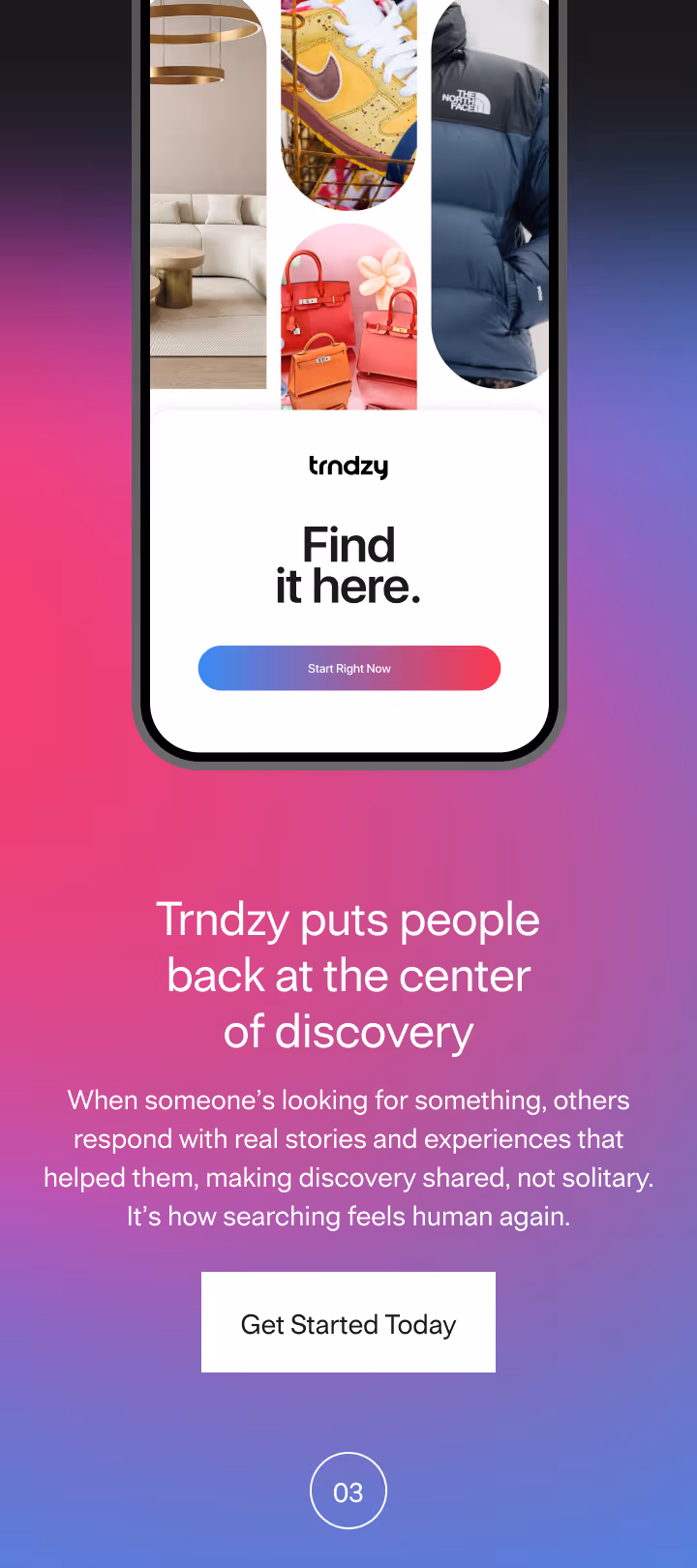 Trndzy turns scattered searching into shared discovery.Instead of scrolling through ads and unreliable reviews, users post what they’re looking for and receive real-time recommendations, links, and lived experiences from the community. Discovery becomes collaborative, contextual, and grounded in trust.We led positioning, go-to-market strategy, and full product experience to define Trndzy as a social network for products and services rather than a traditional marketplace.