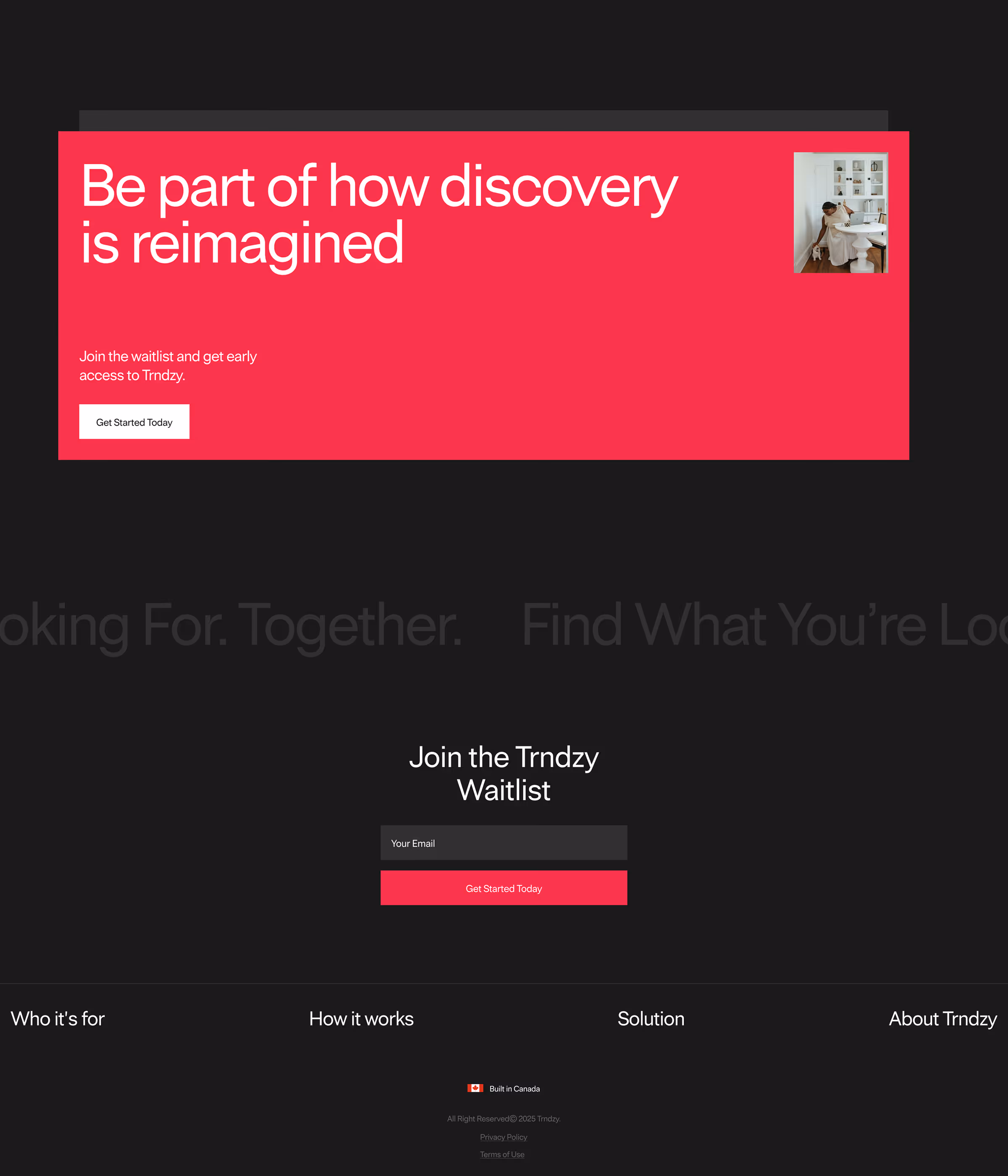 We designed the Trndzy web experience to translate the product’s energy into a clear, focused narrative. The site centers on demand-first discovery, explaining the “Looking for” and “Drops” system in simple, intuitive language while reinforcing trust and credibility. Clean layouts, strong typography, and bold accent moments mirror the product UI, ensuring brand consistency across touchpoints. The result is a web presence that educates, builds anticipation, and converts curiosity into community.